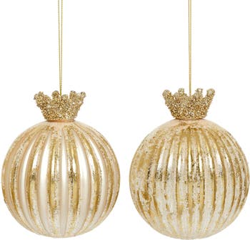 These are elegant gold crown flute ornaments, designed to add a royal touch to holiday décor. Each round ornament features shimmering vertical stripes with a textured metallic finish that catches the light beautifully. Topped with a glittering crown accent, they bring a regal and luxurious charm to any Christmas tree or festive display.