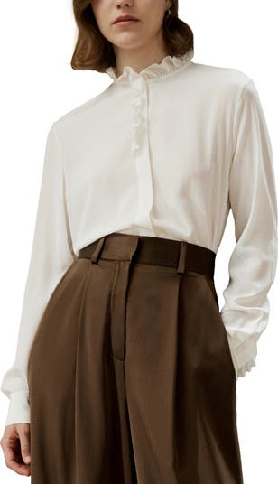 Crafted from lightweight and durable crepe de chine, the charming blouse comes to life with layers of romantic ruffles at the collar and cuffs for a vintage French style. This old fashioned romance makes you an understated star at work or at parties.