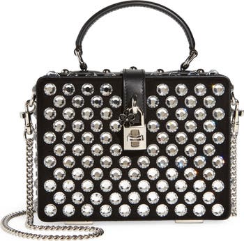 A single bloom adorns the padlock-inspired hardware on an angular box bag studded with sparkling crystals.