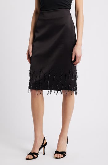 A figure-skimming skirt cut from soft matte satin is defined by tonal beaded embellishments that define the hemline for a more elevated look.