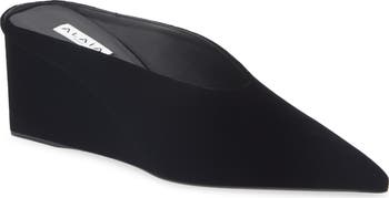 A knife-sharp pointy toe and wrapped, cube-like wedge heel bring intriguing geometries to this mule that s updated for the season in velvet.