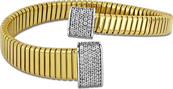 Sparkling cubic zirconia stones form a graceful graduated bypass wrap on these omega stretch bangles in sterling silver and two-tone sterling silver. Their sophisticated design adds elegance and movement, perfect for elevating both casual and formal ensembles. A versatile duo that brings timeless sparkle and refined style to any occasion.