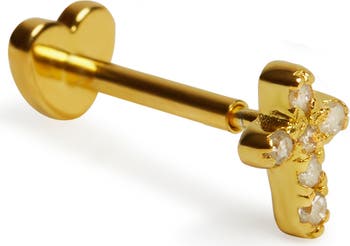 Pavé cubic zirconia illuminate a dainty cross stud earring crafted from sterling silver and finished in 14-karat-gold plate.