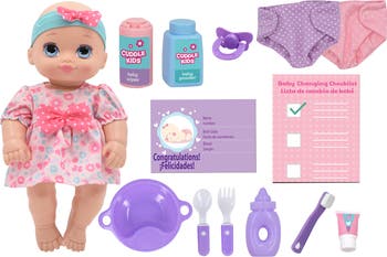 Who wants to Play All Day? Cuddle Kids 10" Play All Day baby doll is ready for some fun with you! She is ready to eat, have her diaper changed or brush her teeth. She has everything you need to care for her and get her ready for a full day of fun. Includes 10" baby doll with removable outfit and matching head band, toothpaste, and toothbrush to make sure her teeth are clean, pacifier when she is fussy, baby bottle feeding dish with spoon and fork to feed her when she is hungry, play powder bottle, play baby wipes bottle, 2 fabric diapers, changing check list and birth certificate. Perfect for ages 2 and up.
