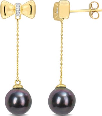 These elegant bow tie drop earrings are crafted in 10k gold and feature lustrous 7-7.5mm cultured pearls, accented by delicate diamond accents. With their classic bow tie design and the interplay of pearls and diamonds, they add a touch of timeless elegance and sparkle to any ensemble.