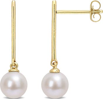 Add a touch of sophistication with these Cultured Freshwater Pearl Linear Dangle Earrings in 10k Yellow Gold. The delicate pearls elegantly dangle from a sleek gold design, offering a timeless look that complements any outfit. The warm yellow gold setting enhances the natural luster of the pearls, making these earrings perfect for both casual and formal occasions.