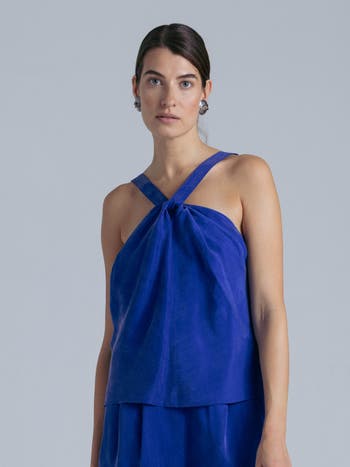 The cupro cross-front halter top is a lightweight summer top. With a sculptural neckline, long adjustable straps, and refined buckle details at the back, this sleeveless blouse balances softness with structure. Made from breathable, silky cupro, it’s the perfect elevated summer top for effortless days and polished evenings.