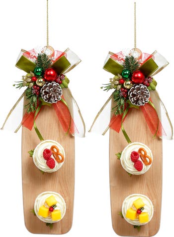 A slim wooden cutting board is elegantly decorated with festive holiday accents at the top, featuring ribbons in green, gold, and red, along with ornaments, berries, pine leaves, and a frosted pinecone. Two beautifully frosted cupcakes are arranged on the board — one topped with raspberries and a pretzel, and the other with yellow fruit and red berries. The overall design combines rustic charm with cheerful holiday elegance, perfect for a seasonal display or gift.