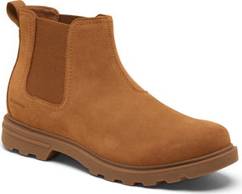 Comfortable, durable and ready for anything, this Chelsea boot made of waterproof leather sits on a lugged rubber sole that puts sure footing under every step. The plain toe and tonal goring keep the styling streamlined and simple, so it s easy to wear with any rain-or-shine look.