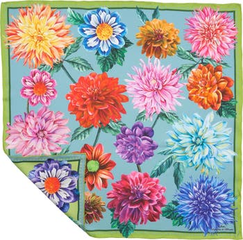 Dahlias In Bloom is a 23" x 23" silk square woven with elegance, bursting with vivid florals that evoke a painterly garden in full bloom—perfect for an artful finishing touch. Lightweight and luminous, it brings a graceful pop of color to any look.