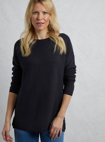 You will love the versatility of the Dalla knitted crew neck sweater. It has a great slouchy, relaxed fit, and a fine-gauge knit, so it is easy to manipulate and tuck to create a chic look with our skirts and shorts, or it equally makes a great, quick, pull on jumper to throw on with your favourite jeans too. It comes in a range of beautiful colours which look fantastic with a patterned bottom, or go simple and timeless by choosing the classic navy.