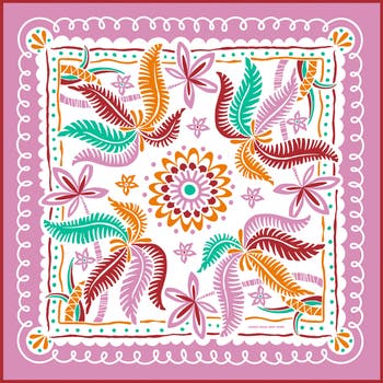 "Dancing Palms" is a lively tribute to tropical elegance, capturing the carefree spirit of swaying palm leaves under the sun. The design blends vibrant foliage with playful floral accents, creating a pattern full of rhythm, freedom, and summer energy. With its bold yet refreshing color palette mirrored on both sides, the scarf ensures a balanced, eye-catching look from every angle. Finished with meticulously hand-rolled edges, it brings a touch of refined luxury to this joyful and spirited piece, coming with a high-end package that makes it perfect for gifting.