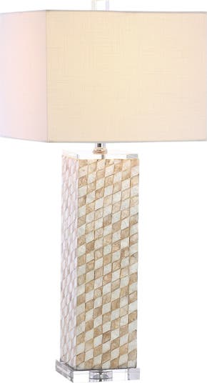 Resin and the iridescent interiors of natural seashells come together to create a harlequin mosaic on the base of this beautiful table lamp. The mother of pearl finish delivers a distinct personality to the design of this otherwise classic silhouette, while a linen hardback shade completes the look. In shades of champagne, cream, and ivory, the neutral shimmer of the design glows when illuminated by the light above -which is compatible with LED, incandescent, or CFL bulb options.