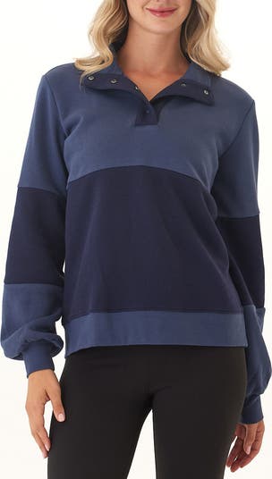 A colorblock design and half-snap closure amplify the sporty vibe of this comfy pullover sweatshirt cut from soft cotton-blend fleece.