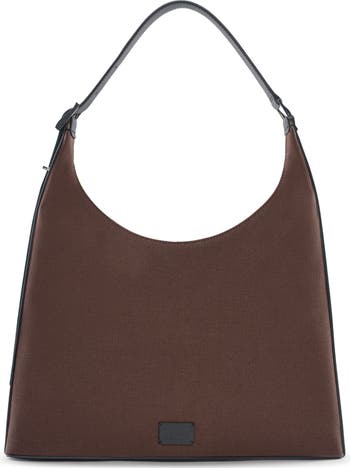 Clean lines and a structured profile define a canvas shoulder bag trimmed with leather and suspended from a single strap that adjusts for versatile wear.