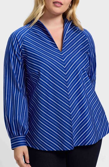 A chic and structured stand collar begins the deep neckline of this crisp cotton-blend shirt made with a touch of stretch.