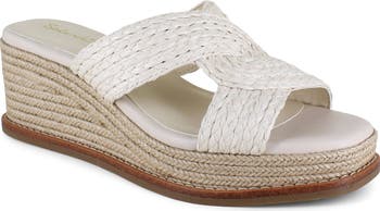 Espadrille-inspired braiding amplifies the earthy appeal of a platform wedge sandal topped with artfully twisted straps.