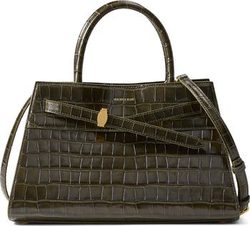 A belt with gleaming hardware cinches the scaled-down profile of this croc-embossed leather tote featuring a pair of rolled top handles and an optional crossbody strap for hands-free carry.