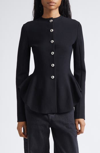 A wavy flared peplum brings dimension to this fitted sweater-jacket knit in a shape-retaining compact stitch, while silvery domed buttons polish off the sculpted look.