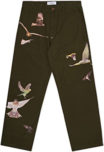Airborne birds bring offbeat energy to these straight-leg cotton-twill pants finished with a wooden button.