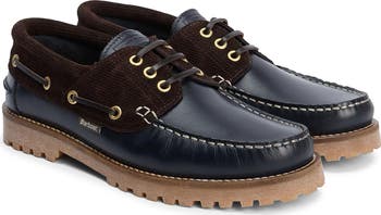 A smooth leather and velvety corduroy upper creates textural interplay on this boat shoe built on a sturdy lug gum sole.