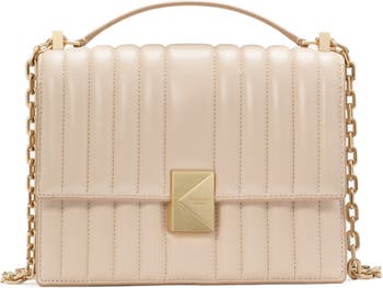 Iconic logo hardware highlights the quilted leather exterior of a structured bag suspended from a lustrous chain strap that converts from shoulder to crossbody wear.
