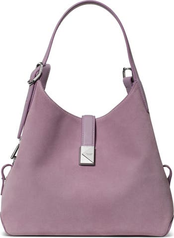 Signature logo hardware and soft suede distinguish a luxe shoulder bag furnished with a divided interior for optimal organization.