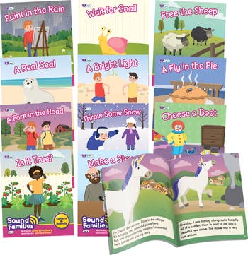 This set of fiction Sound Families decodable readers covers long vowels (/ai/ /ee/ /igh/ /oa/ /oo/ and /y-oo/). There are two titles for each sound. Within each reader, alternative spellings are provided (graphemes) for the target sound (phoneme). Children can identify the target sound in the text quickly as they have been highlighted and then compare the spelling across the sound family. Other words included are decodable at the phase level as well as common exception words in accordance to the progression. The set includes 12 fiction readers, each with colorful illustrations. For ages 5+, Grade 1, Book Band: Turquoise (Fluency 2), Guided Reading Level: I - J, Reading Level: 16 - 18.