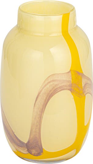 - A round glass vase that features a vibrant and artistic abstract design in yellow and purple colors