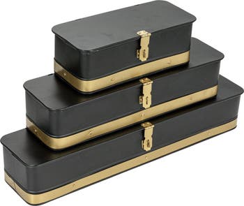 This set of three rectangular nesting metal storage boxes is a decorative and functional product that can enhance any space. The black boxes have an antique gold band and clasp, giving them a glam, industrial, or vintage look. Each box is nestable allowing them to be stored inside each other when not in use. The largest box measures 20.5 inches in length, 4.8 inches in width, and 3.5 inches in height. Use for standalone decor on shelves or as storage to hide away remotes, jewelry, keys, coins, or stationery.