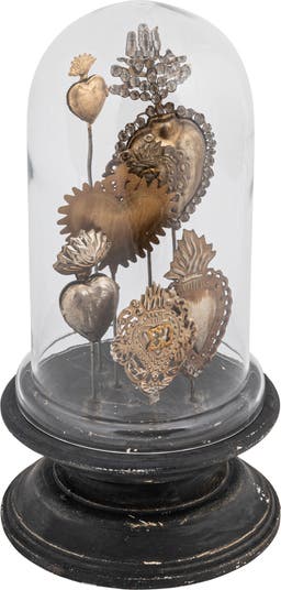 Decorative Tin Sacred Hearts on Wood Pedestal with Glass Cloche