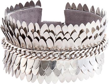 This bold cuff bracelet centered with a line of crystals and clad with tiers of feather-like fringe brings texture to night-out looks.