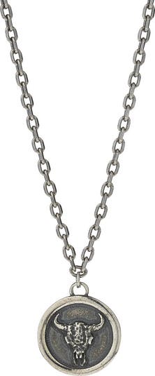 This sterling silver pendant necklace with a knife-edge chain features a bull skull on an aged coin.