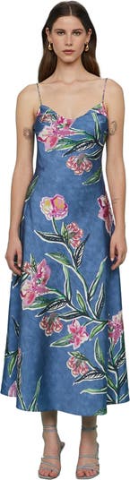 This bias-cut slip dress flows effortlessly, with a water lily print that vines across the body. A fluid, flattering silhouette and delicate straps create an elegant, flattering shape.
