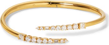 A mix of rounded and rectangular cubic zirconia twinkle along the tapered ends of an elegant bracelet plated in 18-karat gold.