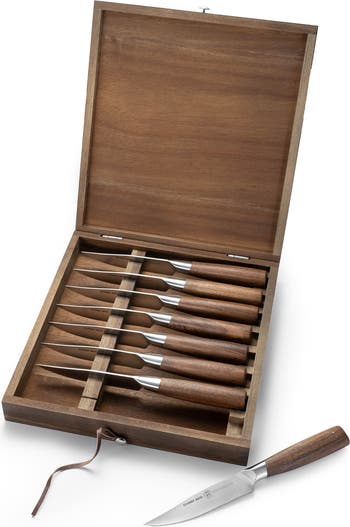 - This Set Contains: Eight razor-sharp 4.5" Steak Knives engineered for a comfortable grip; Delivered in an elegant, natural pine presentation box perfect for a gift or keepsake. Technical Details: Blade Hardness: 59 +/- HRC