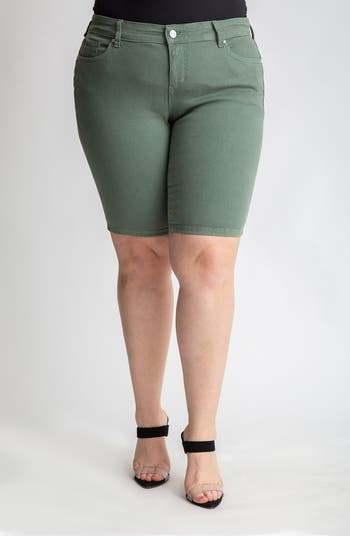 These stretch-enhanced denim shorts offer a little more coverage on sunny days with a mid rise and longer length.