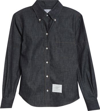 Crafted from lightweight Italian denim, this button-down shirt features signature Thom Browne details like button armbands, a name-tag appliqué and a striped grosgrain loop tab. A crosshatch weave adds texture and dimension to the denim, which is designed to soften and evolve with wear.