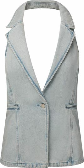 - This denim vest features a low-cut V-neck with a single-button closure, notched lapels, front welt pockets, and an open back. Open back Low V neckline Notch collar One button at center front Two welt pockets Princess seams 100% Cotton Machine wash with like colors. Do not bleach. Tumble dry low. Iron cool. Do not dry clean.