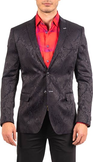Tonal filigree patterns elevate a sport coat tailored from a silky viscose blend with a physique-hugging fit framed in optic-white pickstitching. The sleek patterned lining enhances the all-weather comfort and features a place to stow your smartphone where it s easy to access when you need it.