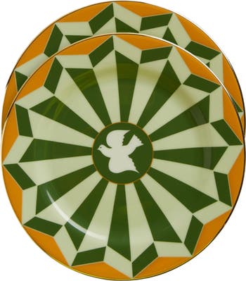 Crafted from the finest Italian porcelain, our Dessert Plates arrive in appropriate high-vibe style, with hand painted 18K gold trims. This geometric set of two in a serene sage green palette is inspired by the drama and romance of Italy’s opulent capital, Rome, and features a white peace dove in its centre. Great for a gorgeous gift, these plates do double duty, so snag a few for your salad course or dot around your home as a handy spot for keys or crystals as well.