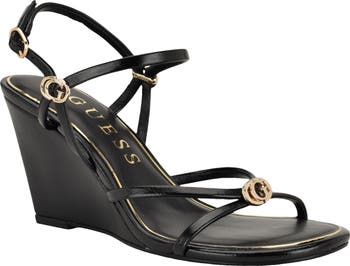 Glinting logo medallions highlight the strappy silhouette of a sleek faux-leather sandal lifted by a wedge heel and secured with an adjustable buckle closure.