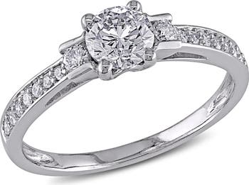 This amazing ring features is round-cut diamond center stone and round-cut diamond side stone set in white gold. The beautiful mounting ring is glimmers with high polished finish.