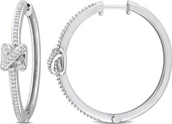 These flattering crossover motif diamond hoop earrings are crafted in lustrous 14k white gold. These intricately detailed earrings feature 88 round-cut, prong-set diamonds studded in the crossover design and extending halfway into the hoop. Enhanced with a polished finish, the earrings are secured with post latch back closures. Pair these elegant earrings with any ensemble for a stunning look.