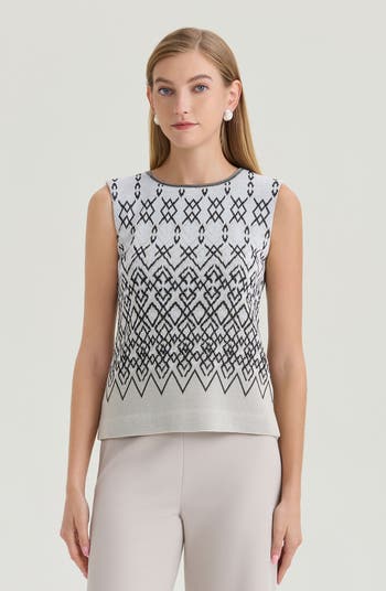 Chic and versatile, the Diamond Jacquard Knit Tank is perfect for relaxed yet polished occasions like brunch or casual gatherings. Featuring a classic jewel neckline, sleeveless design, and side slits for ease of movement, it offers both comfort and effortless style. Wear it on its own or pair it with the matching jacket for a coordinated, elevated look. Our clothing tends to have a generous sizing; if you find yourself between sizes, we suggest ordering one size smaller to achieve a flawless fit.