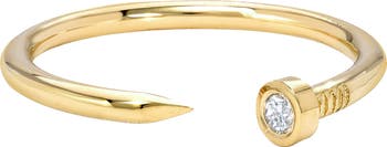 A glittering round-cut diamond and high-polish 14-karat yellow gold elegantly conrast the bold nail-inspired silhouette of this ring.