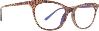 Hand-cut acetate frames elevate eye-catching glasses fitted with scratch-resistant CR-39 lenses that filter out blue light from electronic devices.
