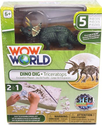 WOWWORLD: DINO DIG - TRICERATOPS - Welcome to Wow World’s Dino Digs Triceratops! Can you dig it?! Excavate an extraordinary experience one dinosaur bone at a time! Chisel through the non-toxic plaster just like a real paleontologist. Use the brush to clean the bones, use the magnifying glass to inspect your work, and assemble all of the bones together into one super skeleton. Crafted from high-quality, non-toxic materials, the Dino Dig Playset is designed for beginners and the experienced alike for safe and long-lasting fun. The PVC bones are both strong and easy to assemble. To make the experience even more interesting you can give the plaster block to someone and don’t tell them which dinosaur is inside! Let them excavate, assemble and discover the mystery on their own. Uncover the past and ignite the imagination. INCLUDES: 1 x plaster block that includes 1 x dinosaur skeleton, 1 x chisel, 1 x brush, 1 x magnifying glass and 1 lifelike dinosaur to demonstrate what the fully intact dinosaur might have looked like millions of years ago.