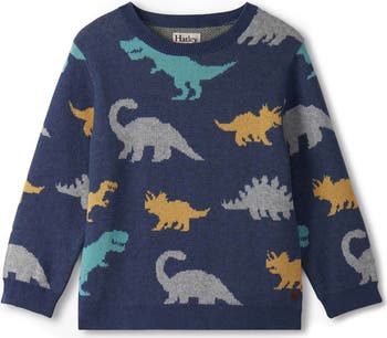 Colorful dinosaurs roam a timeless crewneck sweater made just for baby from pure cotton fibers.