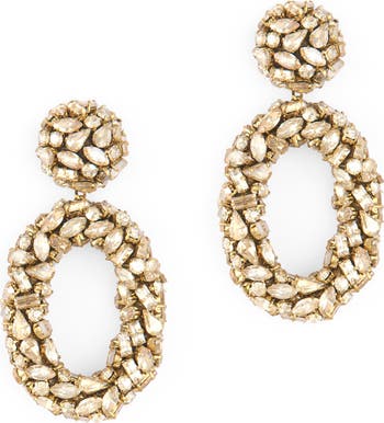 Glimmering glass crystals and metallic glass beads form sculptural ovals on these elegant drop earrings that gleam from every angle.